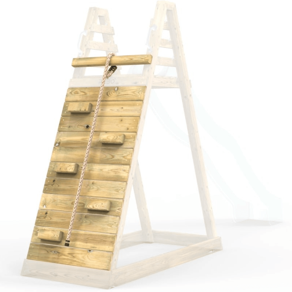 The Adventure wall pack adds a climbing wall with wooden footholds and a climbing rope as a fun alternative for accessing the platform of Rebo’s new 1.5m slide platform.