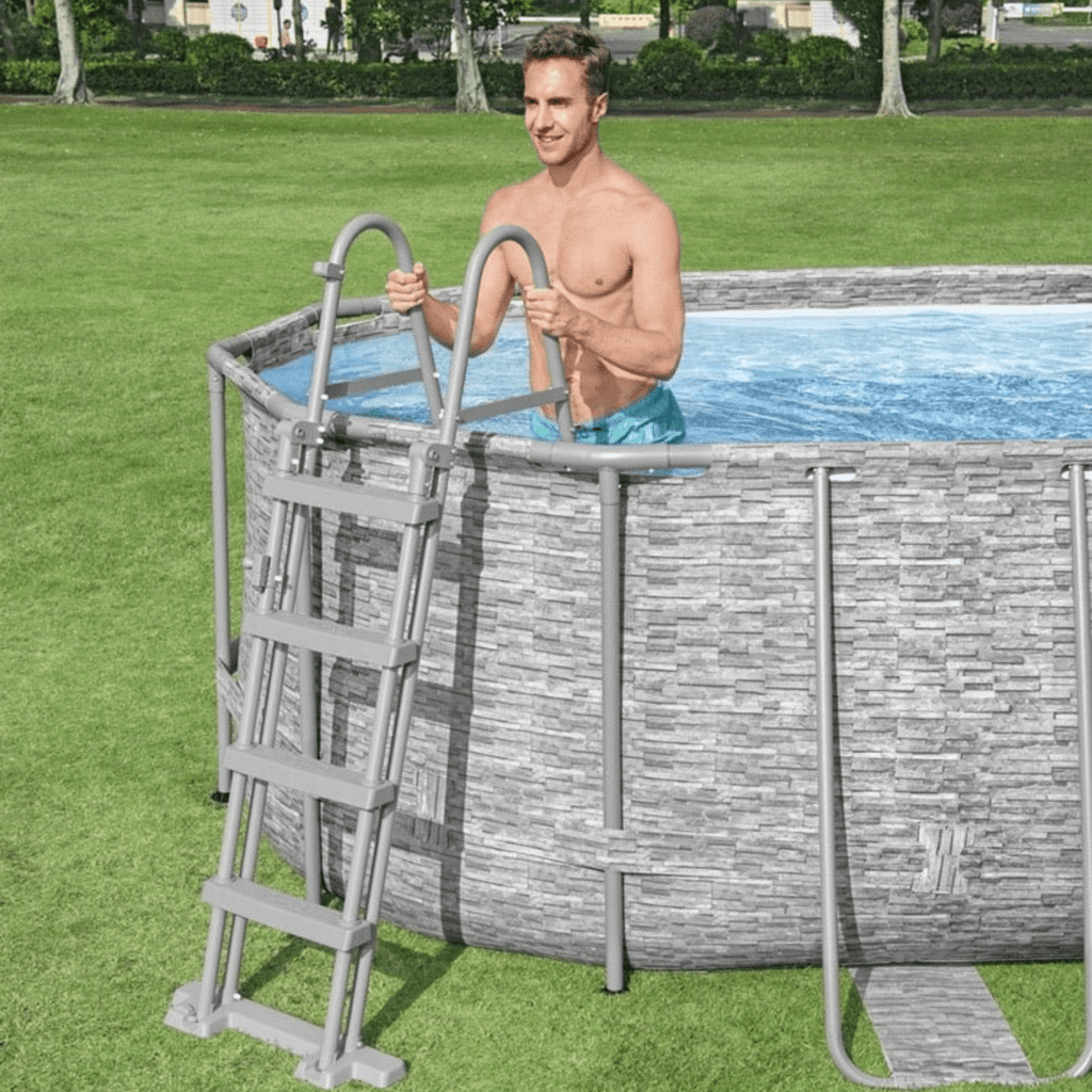The Bestway Power Steel Swim Vista Series™ 18’ x 9’ x 48” / 5.49m x 2.74m x 1.22m Oval Pool Set with Filter Pump has fun built-in pool windows so you can peek inside and watch as others dive down or even allow you to take an underwater picture with ease.