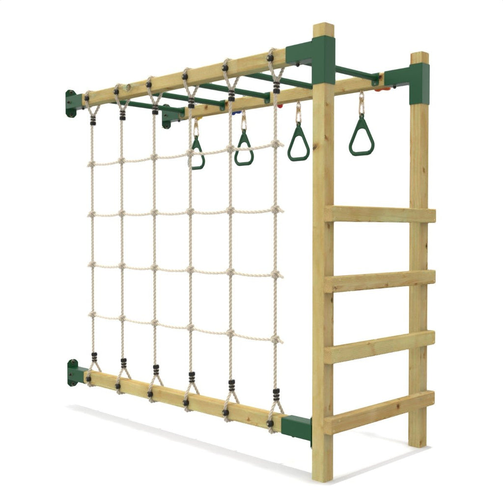 The new OutdoorToys Climbing Frame Monkey Bar Extension Kit with Ninja Accessories adds an exciting new challenge to their playtime. It includes a cargo net, climbing stones to create a traverse climbing challenge, and gym rings.