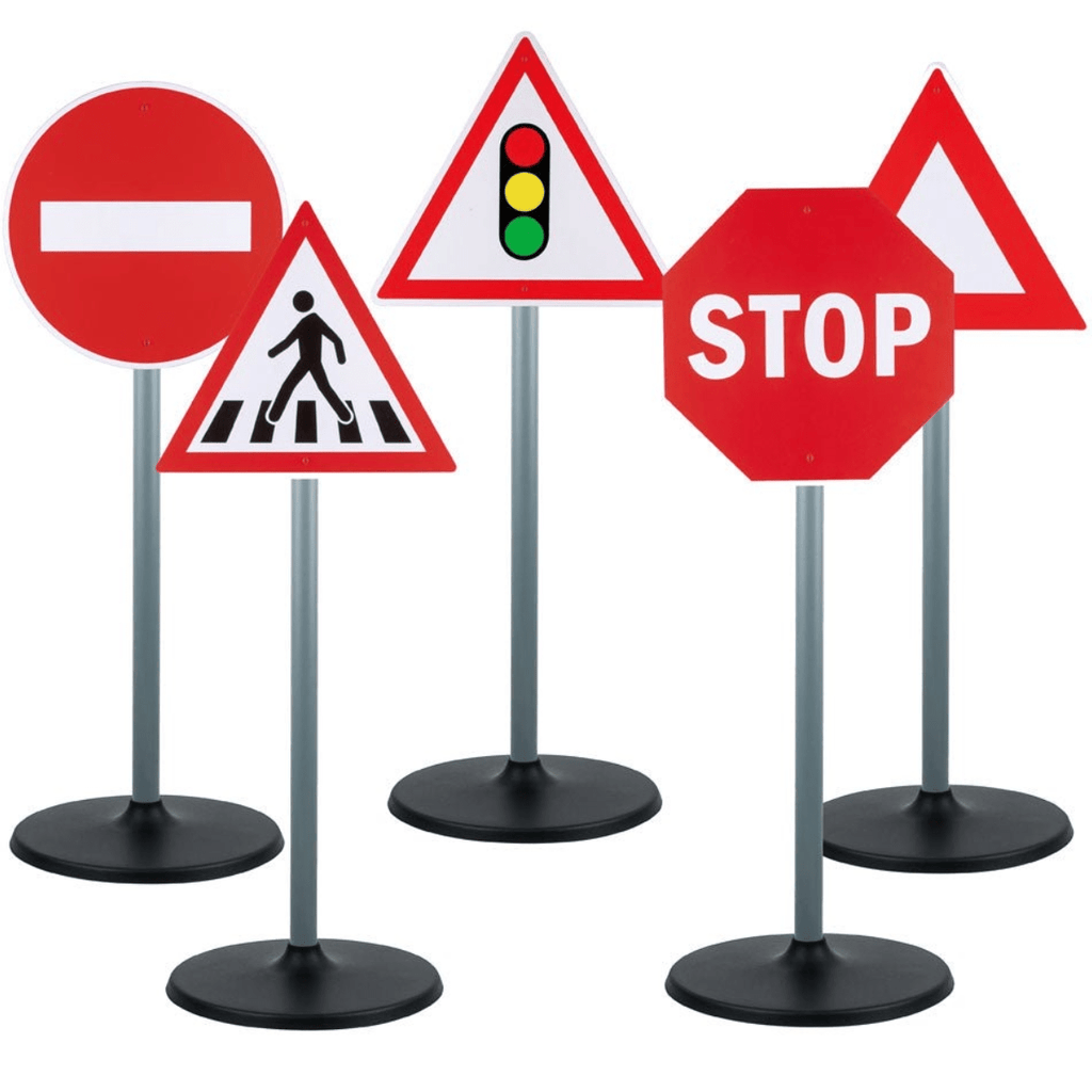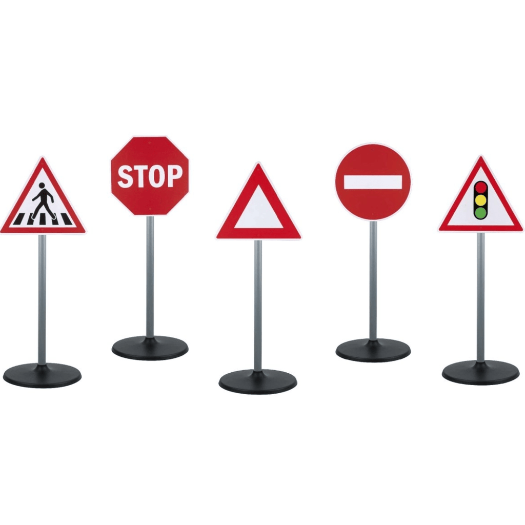 The set of 5 signs consists of Traffic Signals, No Entry, Warning, Zebra Crossing and a Stop Sign perfect for imaginative play.
