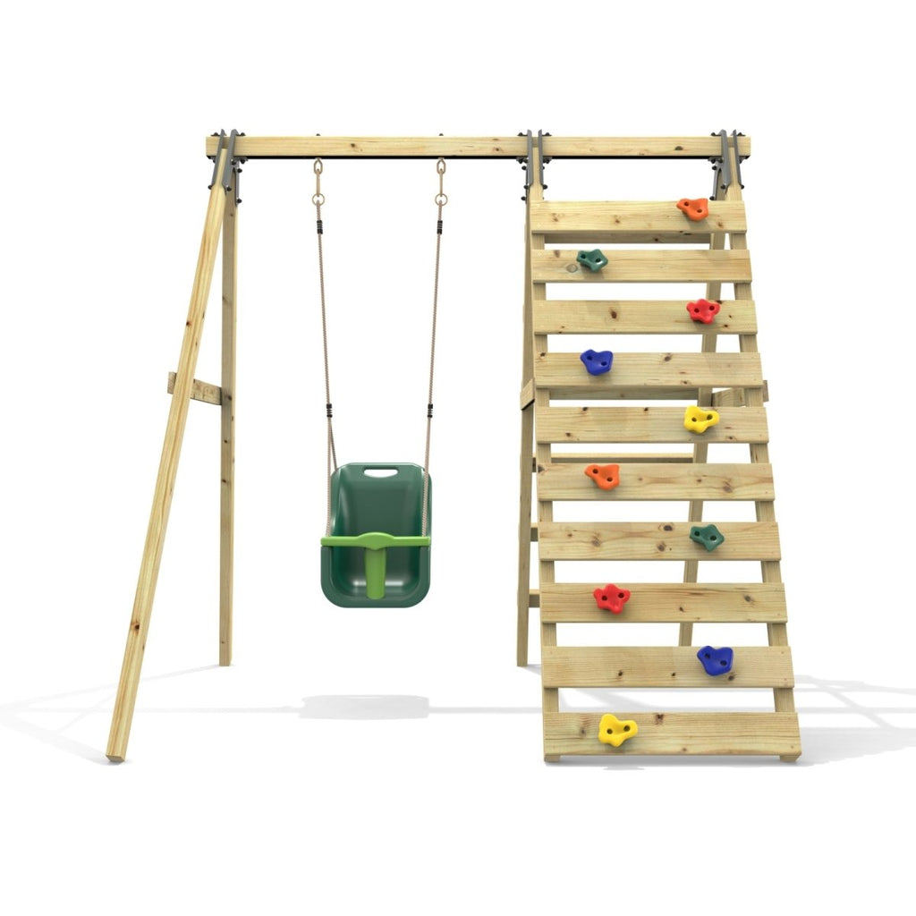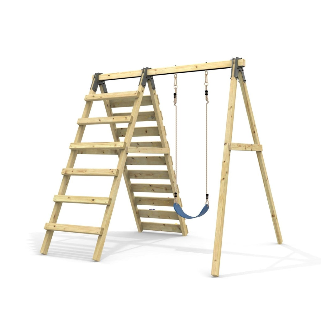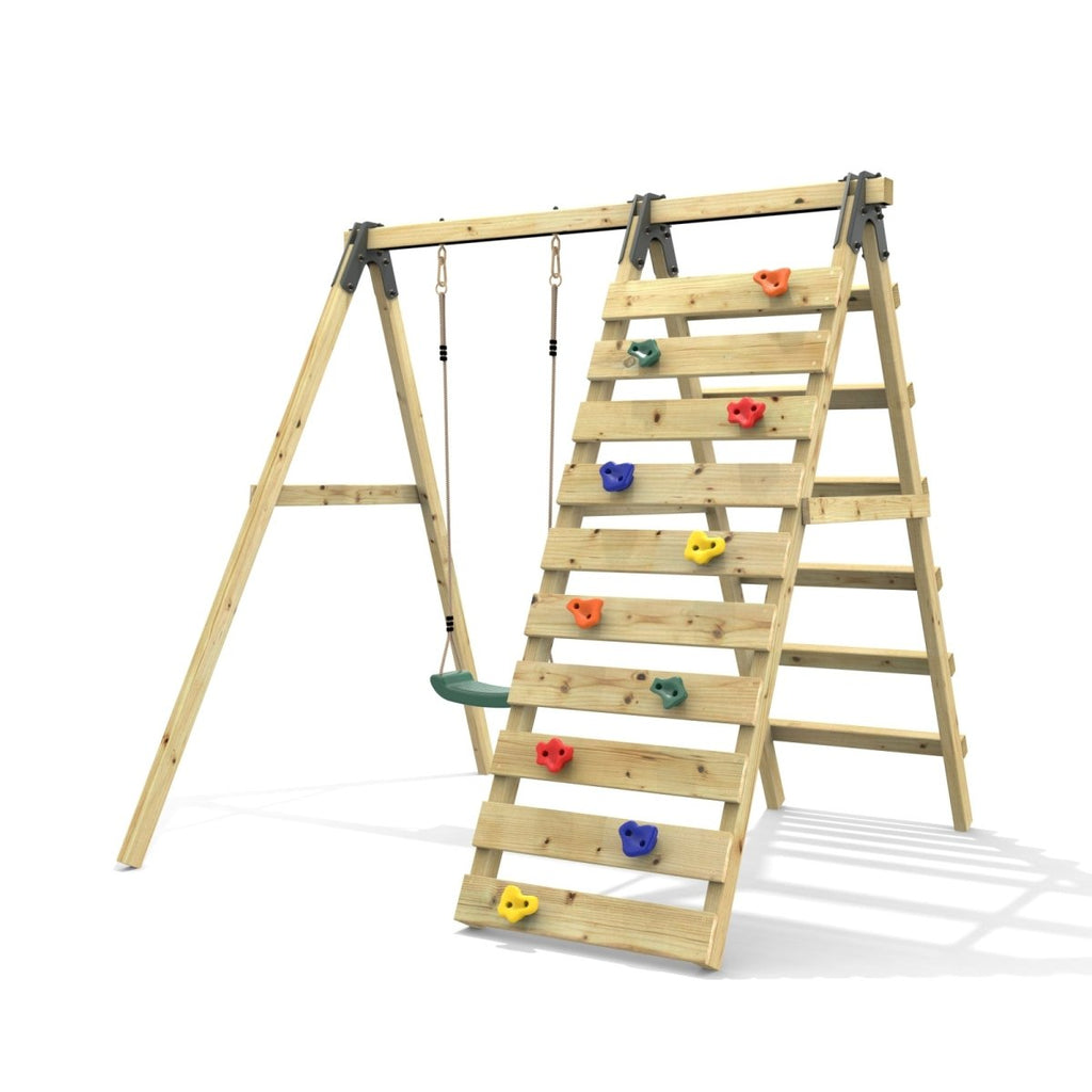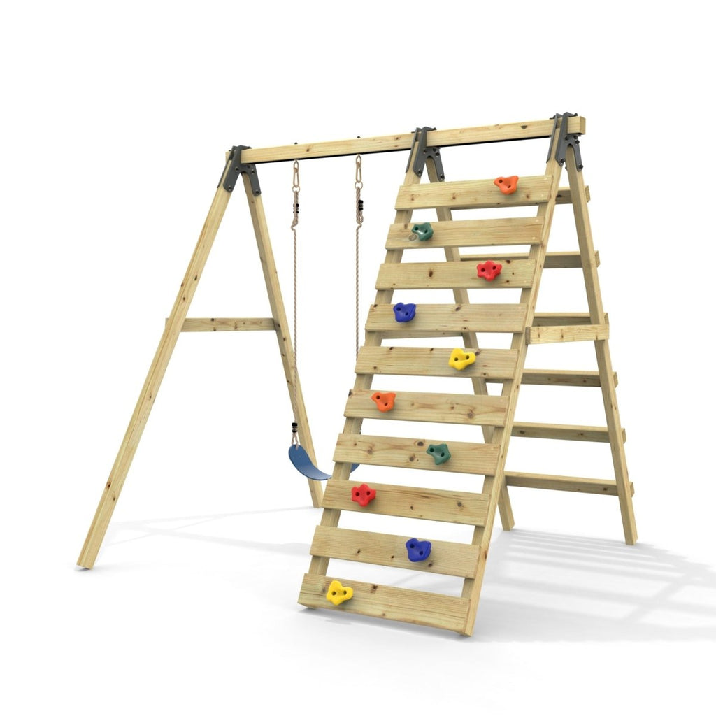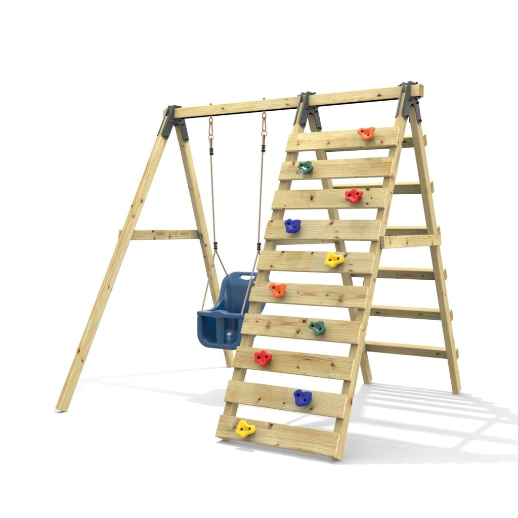 The Lavender single swing with climbing wall is a durable and stylish addition to any garden.