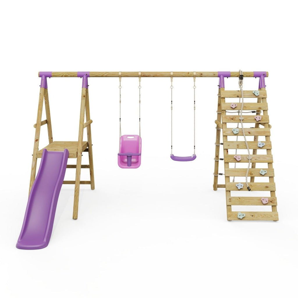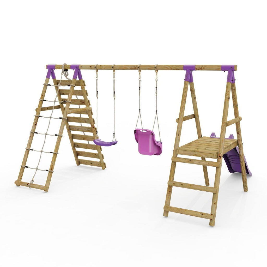 Bringing together the best features from their round wood garden swing range, these exciting sets include a platform with slide, plus the brand-new up and over climbing wall with cargo net.