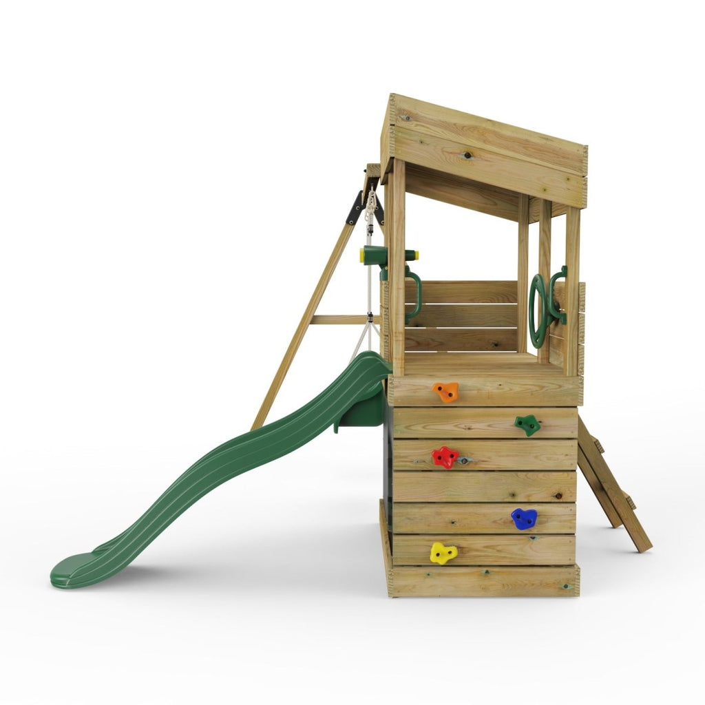Made from pressure treated timber with an injection moulded 6 FT slide, it also has a double swing arm included.